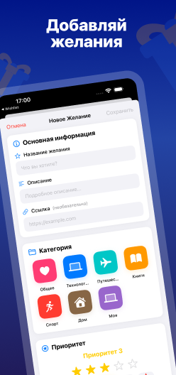 The app is designed to help you organize your wishes, make more mindful decisions, and track your journey from dreams to reality. Structure what you truly want, set priorities, sort your wishes into categories, and monitor your progress. The app helps you avoid impulsive spending and stay focused on what really matters.